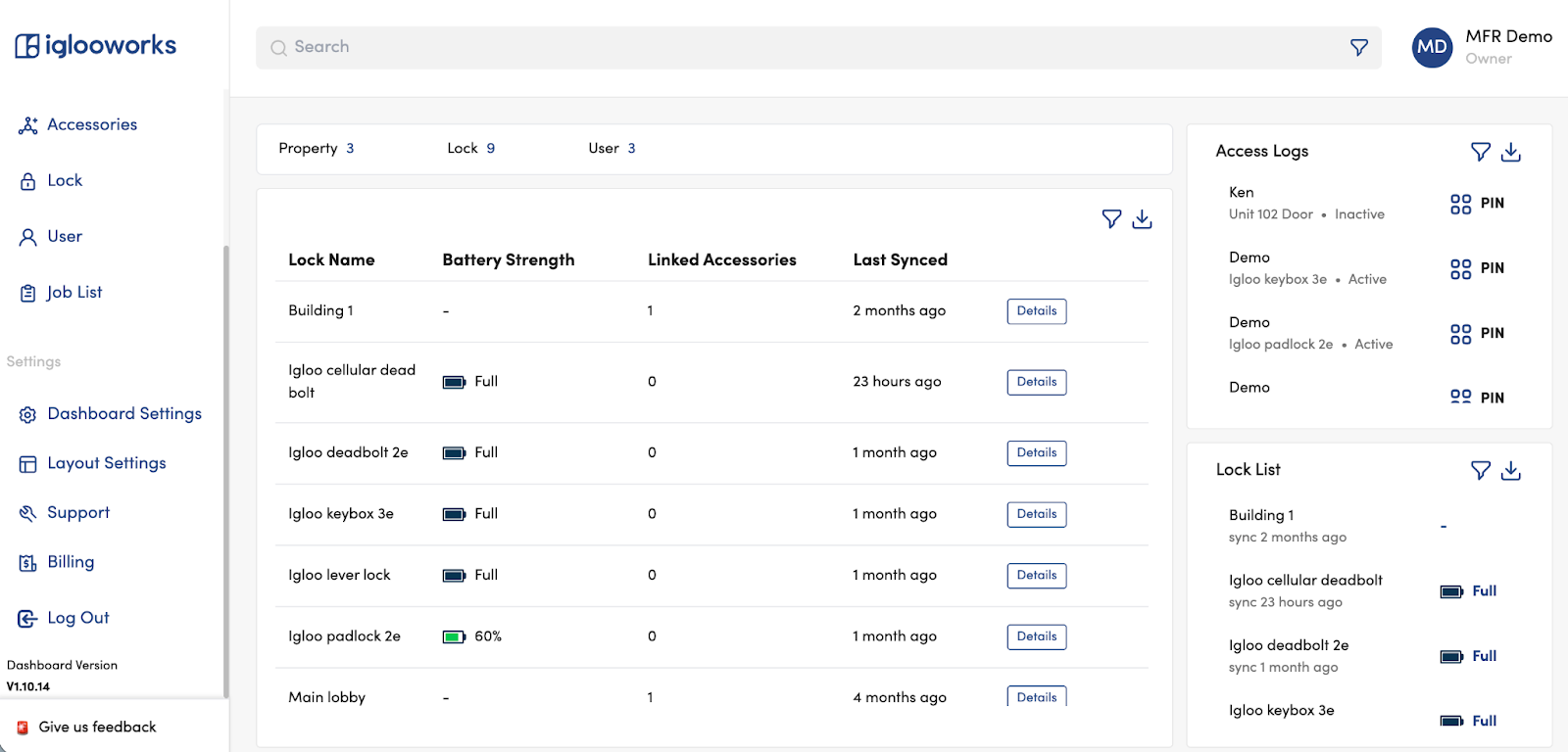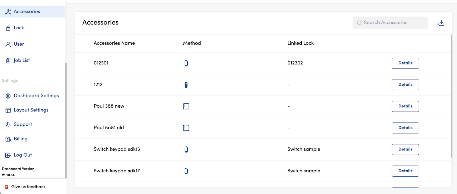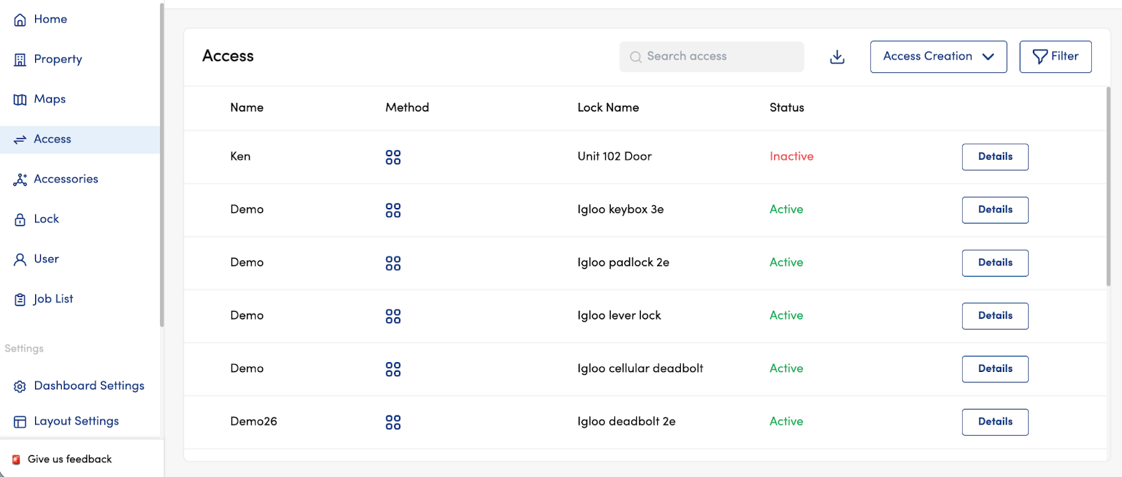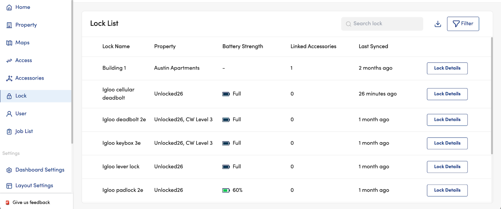 Click Details on any lock to view its full information, activity logs, and associated access credentials.