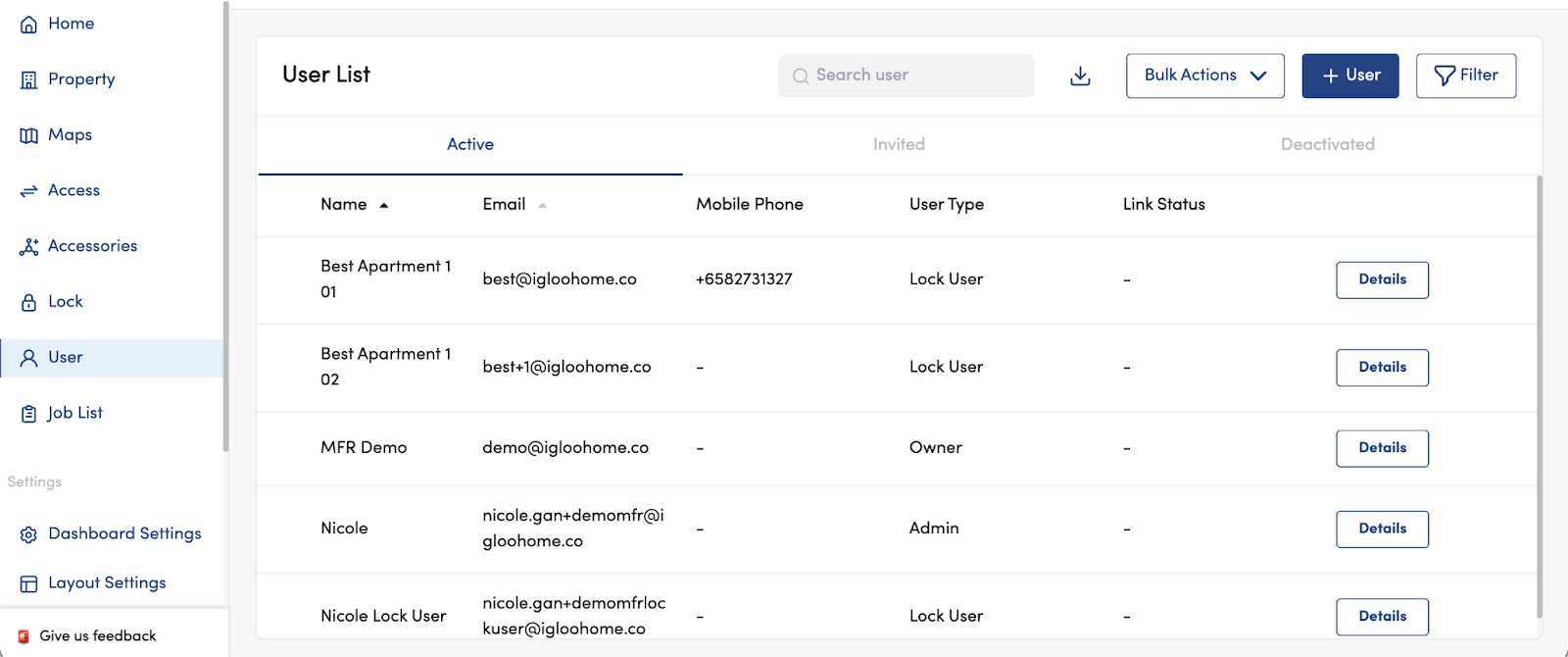 Deactivating a user removes their dashboard and app access and deletes all their Bluetooth keys. Any PINs they previously had access to will still work until expired or deleted.