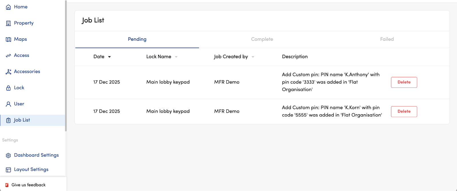 Jobs are Bluetooth actions queued on the dashboard and synced to a lock via the iglooworks app. They are created when you create or delete a Custom PIN.